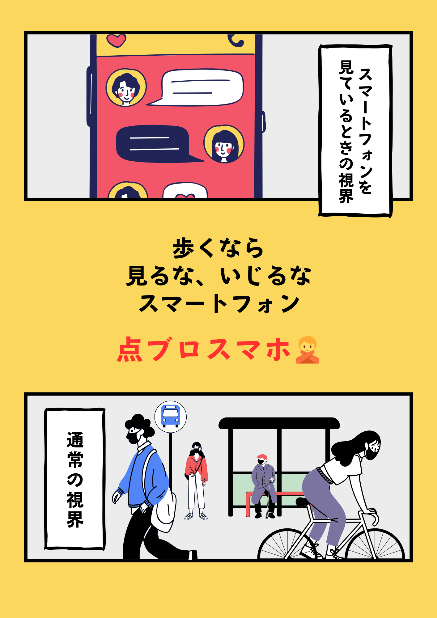 「点ブロスマホ」とは、街中や駅構内、地下街などの歩道にある点字ブロックの上をスマートフォンを見ながら周りを見ずに歩く行為です。点字ブロックをたよりに街中を一人で歩く視覚障がい者の人と衝突し大けがをして救急搬送されたり、白杖が折れた、スマートフォンが壊れた等の物損、場合によっては、大けがでは済まないケースもあるかもしれません。視覚障がい者の方の安全が脅かされる大きな社会問題になっています。